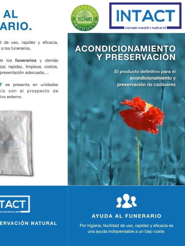Para acondicionamiento y preservación de cadáveres de una forma rápida, sencilla, y no invasiva. Paraliza el comienzo de descomposición del cadáver desde el primer momento. Absorción de gases tóxicos. De aplicación inmediata en zonas de catástrofes. Disponemos de Certificado HaLaL, imprescindible para la comunidad musulmana, siéndoles de gran utilidad ya que con este Certificado HaLal les permitirá su uso y las ventajas que Intact ofrece.