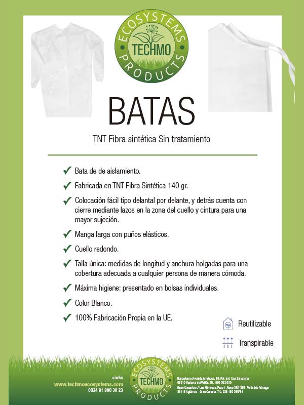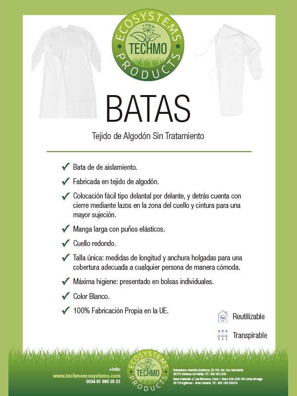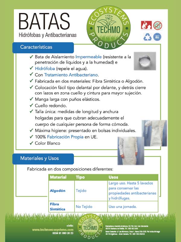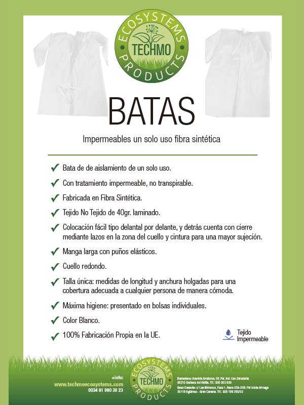 Batas de aislamiento impermeable, resistente a la penetración de líquidos y a la humedad e hidrofoba (repele el agua), con tratamiento anti-bacteriano. Disponibles en material sintético y en algodón. Bata de Color Blanco. Largo uso, permite hasta 5 lavados para conservar las propiedades anti-bacterianas e hidrófugas. También las tenemos disponibles las batas, sin tratamiento anti-bacteriano e hidrófugo.